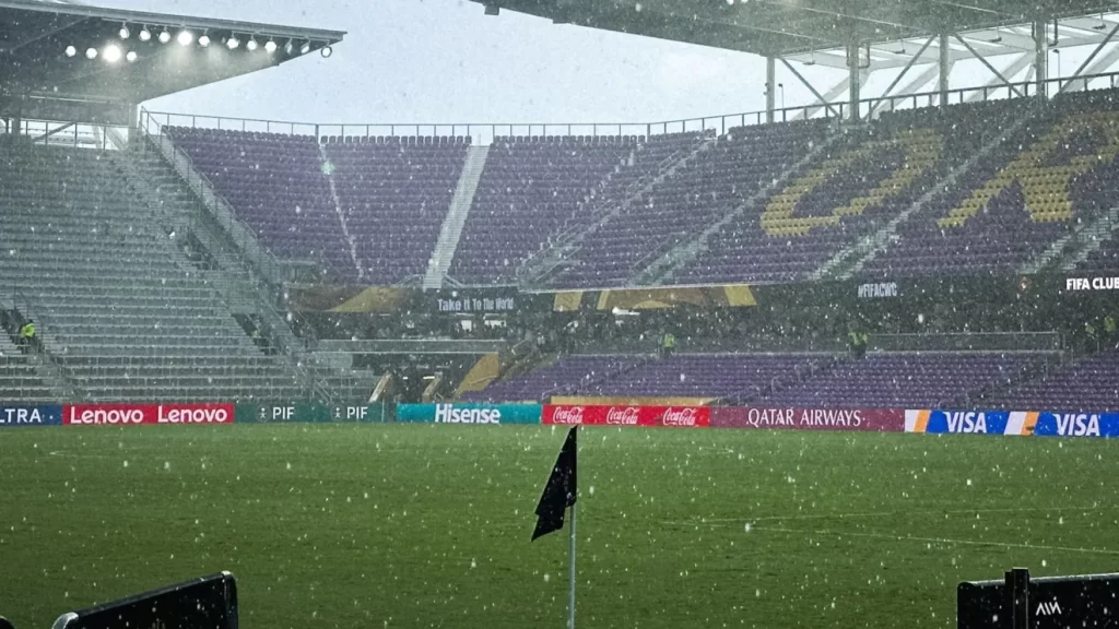 O início do segundo tempo da partida entre Benfica e Auckland City, nesta sexta-feira (20), pela Copa do Mundo de Clubes, foi atrasado em razão de condições climáticas adversas na região do Inter&Co Stadium, em Orlando.