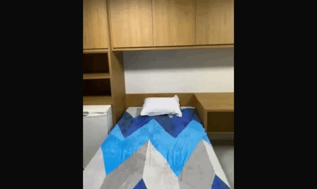 O espaço tem paredes brancas, uma cama de solteiro, armários, mesa de apoio, televisão, frigobar, ar condicionado e uma janela, além de banheiro privativo.